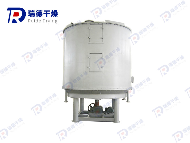 The wet material self-feeder is continuously added to the drying disc on the upper layer of the dryer, and the rake arm with the rake blade is rotated to make the rake blade continuously turn over the material. The material passes through the surface of the drying tray along the exponential helix, and the material on the small drying tray is transferred to the outer edge, and falls to the outer edge of the large drying tray below the outer edge, and the material moves inward on the large drying tower and falls into the next layer of small drying tray through the middle blanking port. The size of the drying tray is arranged alternately up and down, so that the material can flow continuously through the entire dryer. The heating medium in the form of saturated steam, hot water and heat conduction oil is passed into the hollow drying disc. The heating medium enters from one end of the drying disc and is exported from the other end. The dried material falls to the bottom of the shell from the last drying tray and is finally transferred to the discharge port by the rake leaf. Moisture escapes from the material. The moisture of the vacuum type disc dryer is extracted from the moisture outlet located on the top cover. Dry material discharged from the bottom layer can be packaged directly. By adding fin heater, solvent recovery condenser, bag dust collector, dry material remixing structure, induced draft fan and other auxiliary machines, it can improve its drying production capacity, heat sensitive materials, can easily recover solvent, and can carry out pyrolysis and reaction operations.